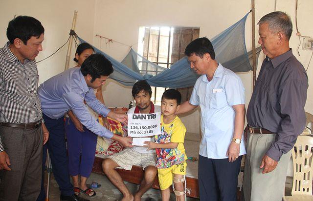 Thay mặt bạn đọc và các nhà hảo tâm, PV Dân trí đã trao số tiền 145.400.000 đồng đến bố con anh Trần Quốc Long (SN 1977) và cháu Trần Thái Phú (SN 2011, thôn Đồng Vịnh, xã Đức Long, huyện Đức Thọ, tỉnh Hà Tĩnh) nhân vật trong bài viết “Xót thương cha và con ôm nhau khóc trên giường vì cùng bị hoại tử xương đùi”.