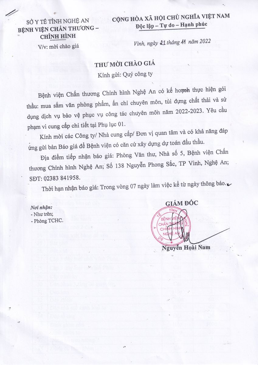 Bệnh viện Chấn thương Chỉnh hình Nghệ An thông báo mời chào giá về việc cung cấp văn phòng phẩm, ấn chỉ chuyên môn, túi đựng chất thải và dịch vụ bảo vệ phục vụ công tác chuyên môn năm 2023 như sau: